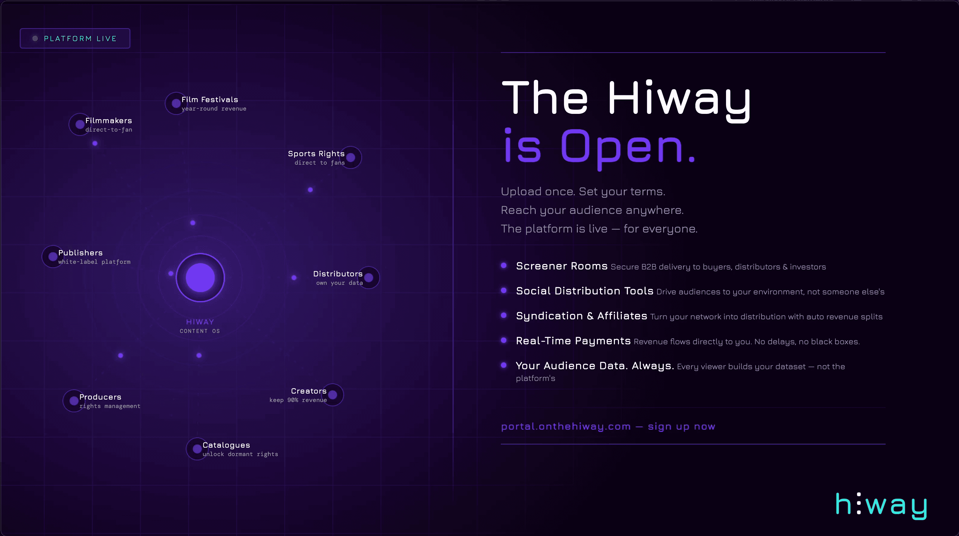 Hiway is now open to all creators, filmmakers, and rights holders. Upload once, distribute to fans worldwide, and keep your audience data. No middlemen.